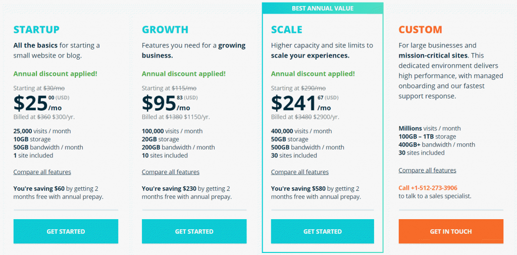 WP Engine’s Scale plan works out about a dollar cheaper, which isn’t much, but it is something. Like Flywheel, WP Engine also offers a Custom plan to agencies with advanced bandwidth and storage needs.