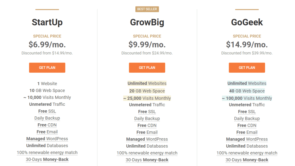 SiteGround’s pricing model is a little different from what most hosting services. They have four plans, but three of them have the same tiers and prices.