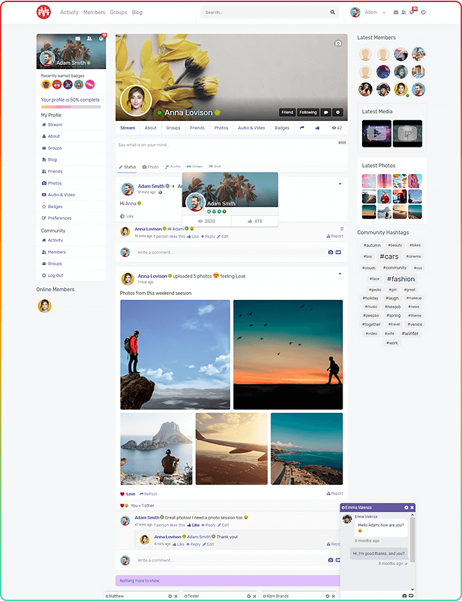 Much like Facebook, PeepSo boasts features like private messaging, a friend system, a blocking system, and more. You can also couple your PeepSo plugin with widgets that enable users to add photos and videos to their profile.